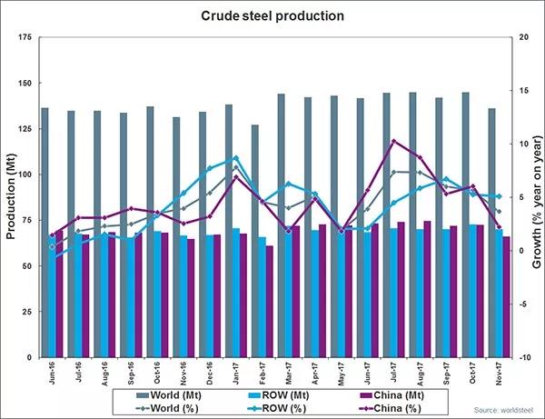 2017年11月全球66個納入世界鋼鐵協(xié)會統(tǒng)計國家的粗鋼產(chǎn)量為1.363億噸,同比提高3.7%;粗鋼產(chǎn)能利用率為70.7%,同比提高1.5個百分點,環(huán)比下降2.2個百分點。